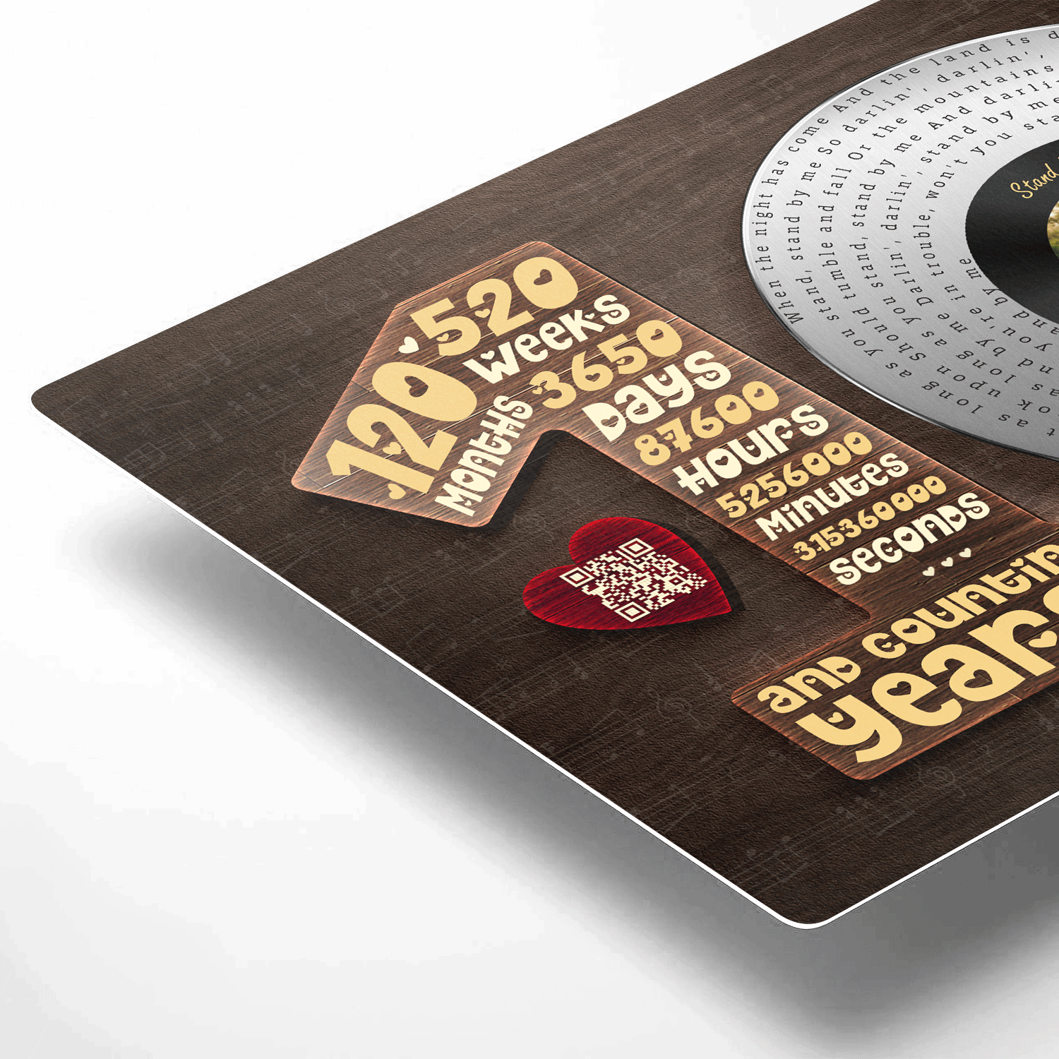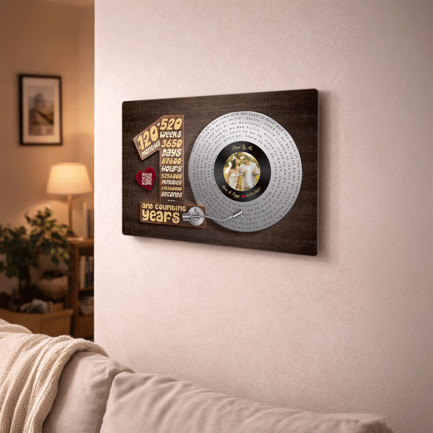 This unique anniversary-themed design celebrates love through time. Featuring a vinyl record filled with meaningful song lyrics, a personalized couple photo at the center and a detailed countdown of years, months, weeks, days, hours and seconds together, this artwork tells the full story of your journey. Set on a warm wood-style background with turntable details, it’s a powerful symbol of commitment and “still counting” love. A meaningful gift for wedding anniversaries, milestone celebrations and lifelong partnerships.
