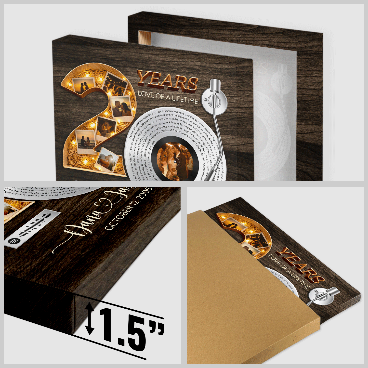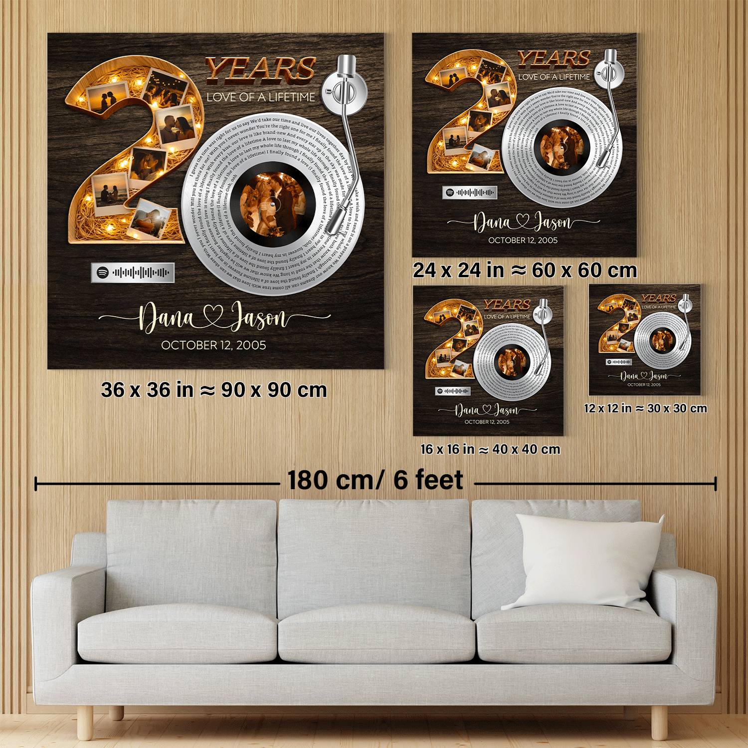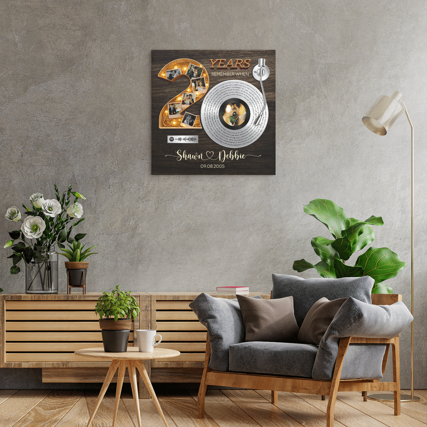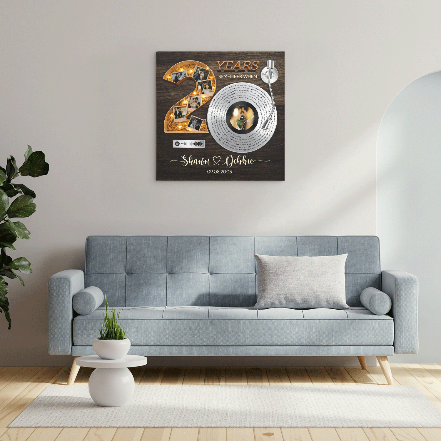 Celebrate twenty unforgettable years together with this personalized 20th anniversary song lyrics canvas, created to honor a love that has grown stronger and more meaningful over time. The vinyl record–inspired design represents a song that defines your journey, while the bold number twenty showcases a timeline of cherished memories captured through photos. This canvas also features a Spotify QR code, allowing you to scan and instantly play your special song whenever you want to relive those moments. Traditionally, the 20 year anniversary is symbolized by china, representing elegance, care, and a bond that has been nurtured with patience and devotion—beautifully reflected in the warm glow and refined details of this design. Fully customizable with your song lyrics, names, anniversary year, special date, and Spotify QR code, this canvas makes a meaningful gift for a 20th anniversary, Valentine’s Day, birthday, or milestone celebration. Perfect for couples, husbands, wives, or partners celebrating two decades of lasting love.