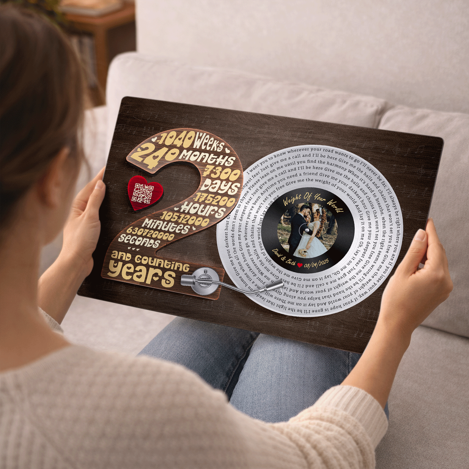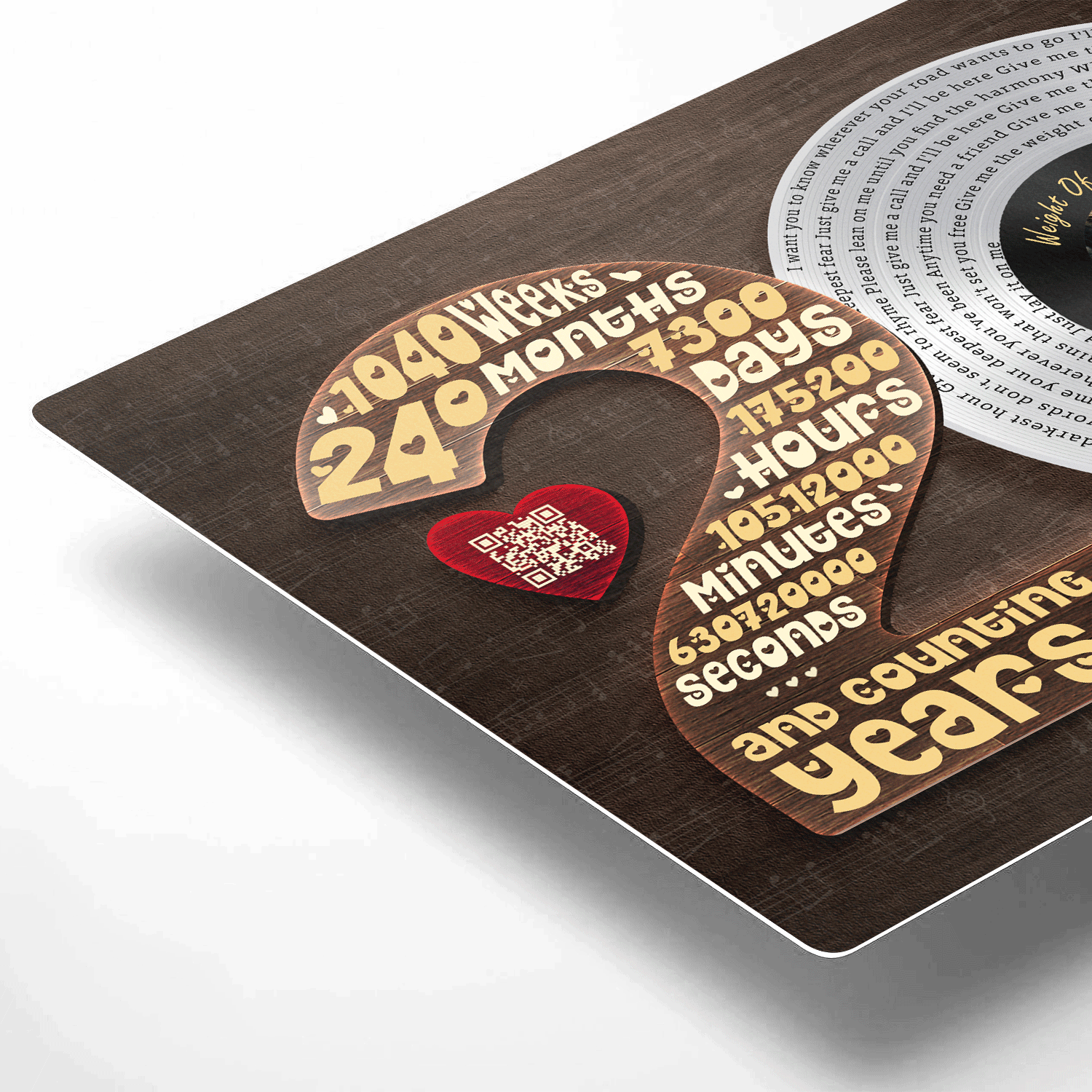 Celebrate 20 years of love with a design that tells your story through time and music. This anniversary artwork features a vinyl record filled with meaningful song lyrics, a personalized couple photo at the center and a detailed countdown of your journey together—years, months, weeks, days, hours, minutes and seconds. Set against a warm wood-style background with turntable details, it symbolizes a love that has grown stronger through every moment. A meaningful keepsake for celebrating a 20th wedding anniversary and lifelong commitment.
