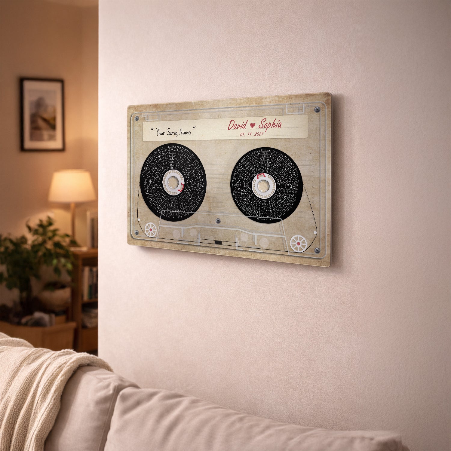 Inspired by vintage cassette tapes, this nostalgic design transforms your favorite song into a meaningful piece of art. The song lyrics are intricately displayed on both reels, while the top label can be personalized with the song title, couple names and a special date. Blending retro charm with emotional storytelling, this artwork is perfect for couples who share a song that defines their love. An ideal gift for Valentine’s Day, anniversaries, weddings or any special moment.
