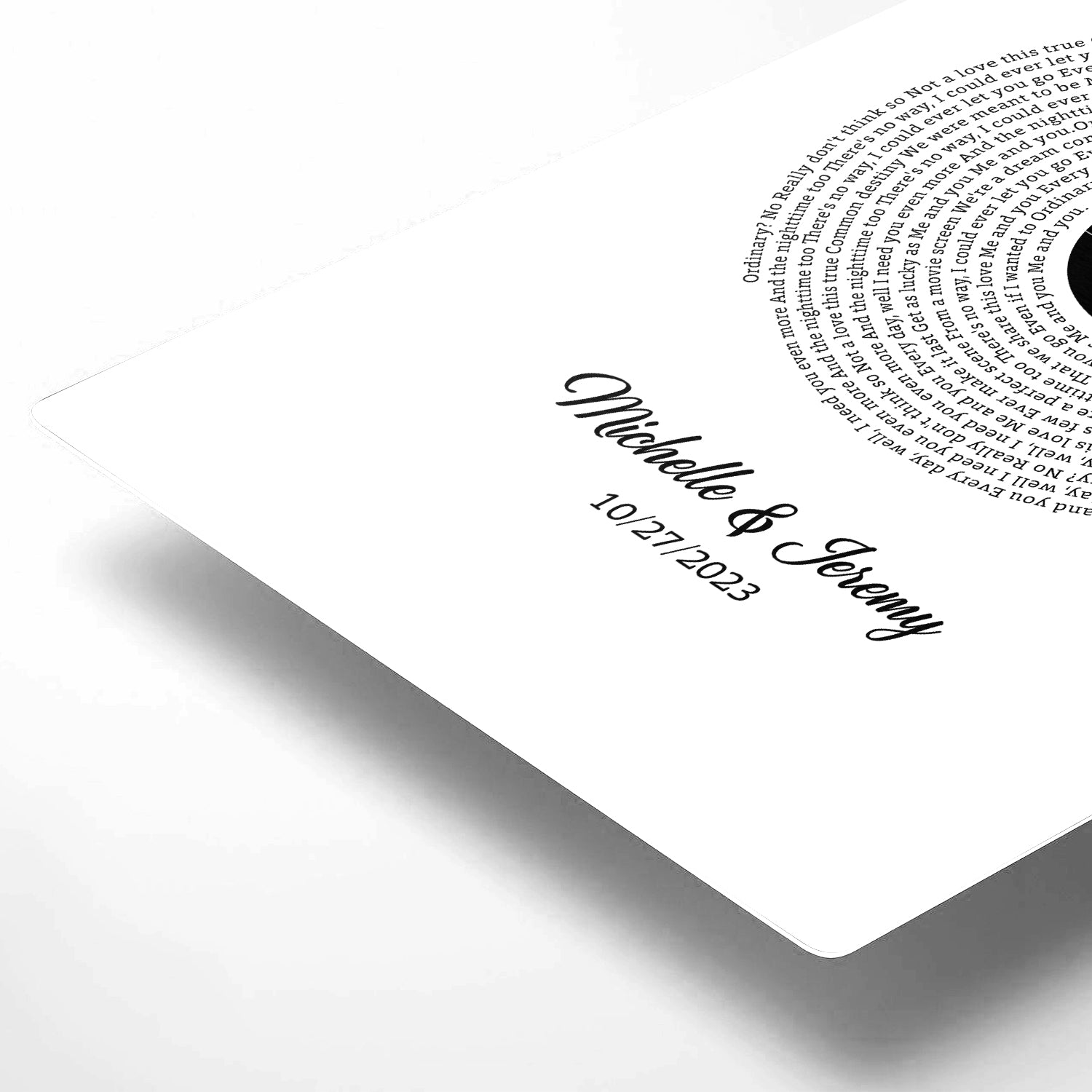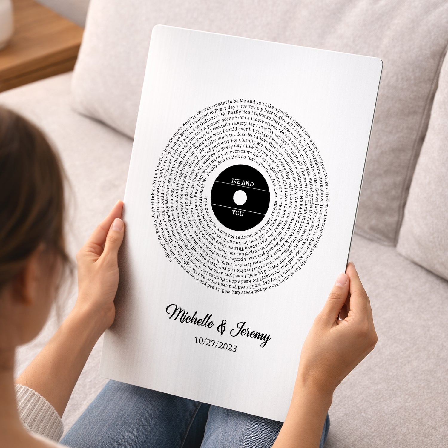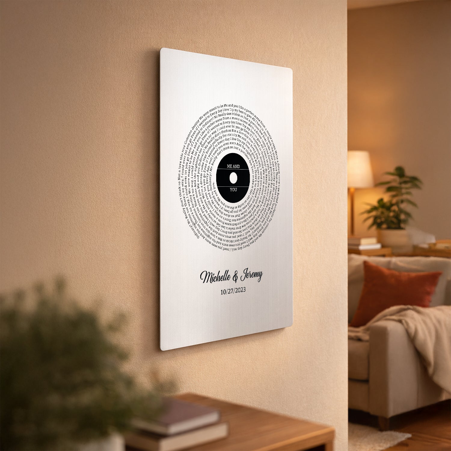 This minimalist design features meaningful song lyrics arranged in a vinyl record–inspired circle, symbolizing a love that always revolves around “me and you.” With a clean black-and-white layout and a personalized center label, names and special date, this artwork captures romance in its purest form. A thoughtful gift for couples celebrating Valentine’s Day, anniversaries, weddings or meaningful milestones.