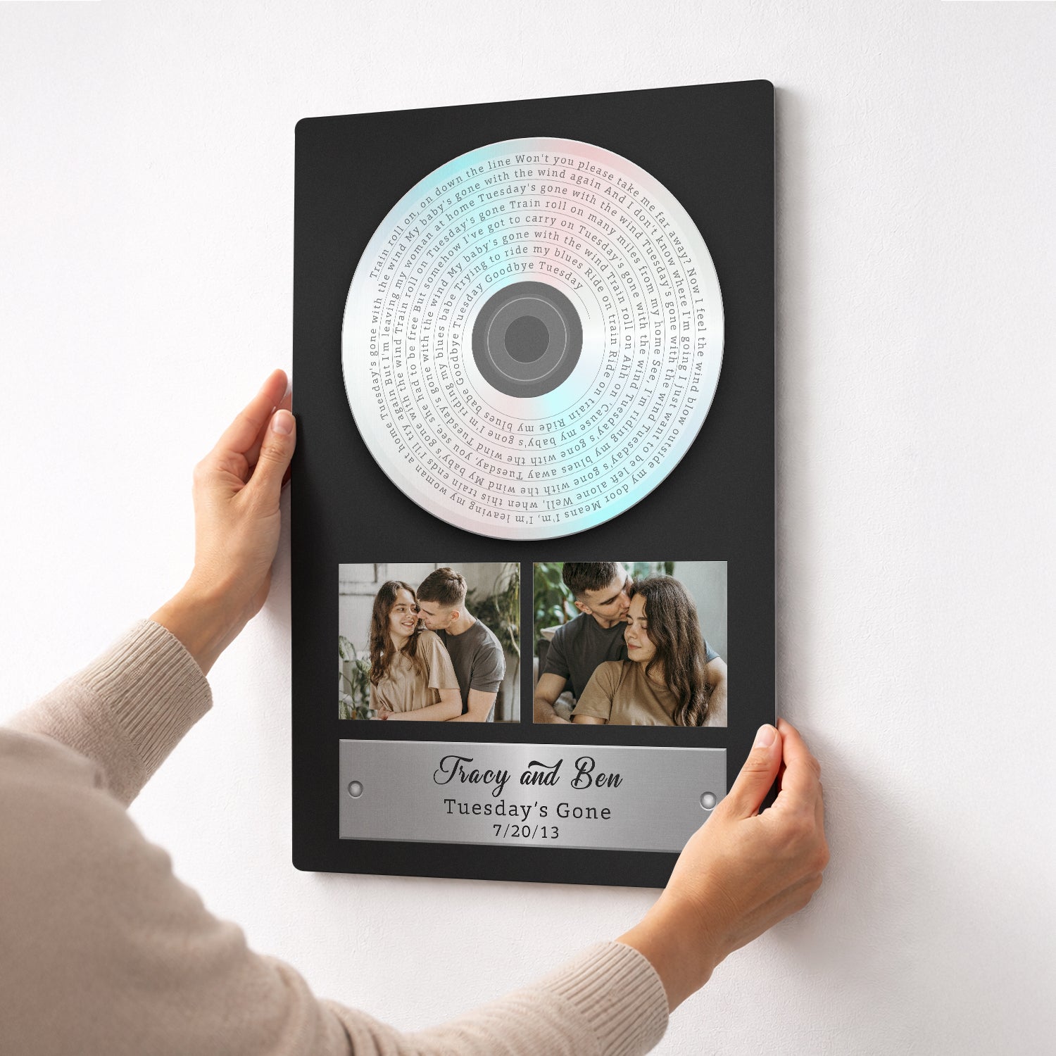 This contemporary design combines meaningful song lyrics displayed in a vinyl record–inspired circle with two personalized photos that capture your love story. Finished with a custom nameplate featuring couple names, song title and special date, the artwork blends music and memories into one elegant keepsake. A perfect gift for couples celebrating Valentine’s Day, anniversaries, weddings or unforgettable moments together.