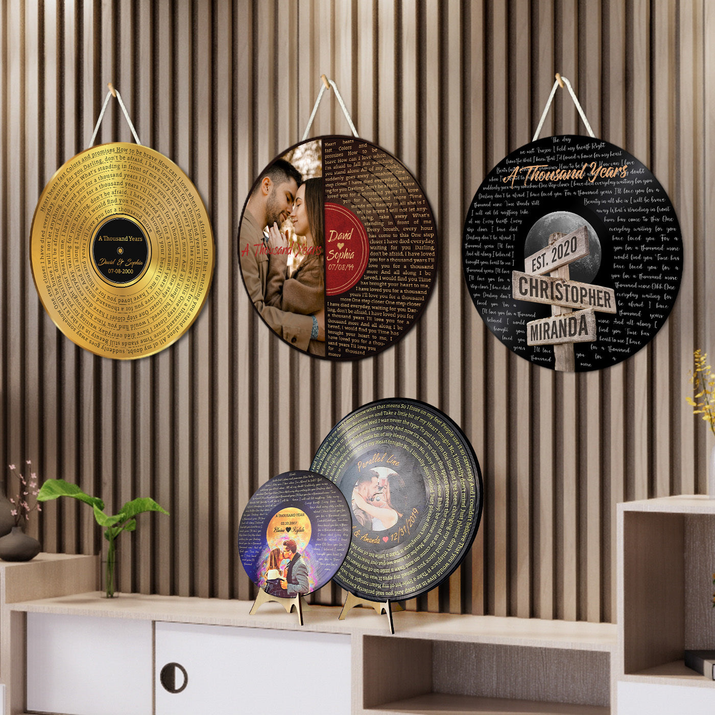 Every song reminds us of special moments. Taking inspiration from classic vinyl records, we have made unique round wood signs in a brand new version that shows song lyrics around the surface. They are like a nostalgic journey through your favorite tunes.