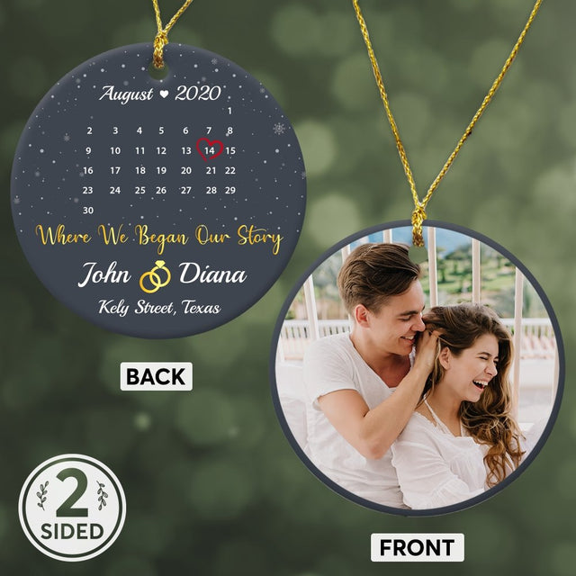 Where We Began Our Story Custom Photo, Date And Text Anniversary Gift Navy Background Decorative Christmas Circle Ornament 2 Sided